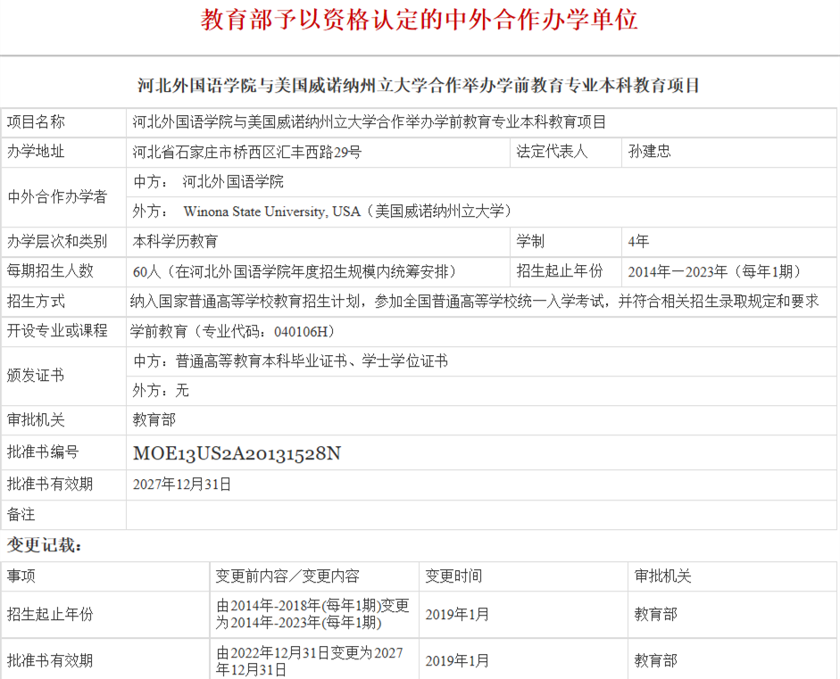 河北外国语学院与美国威诺纳州立大学合作举办学前教育专业本科教育项目