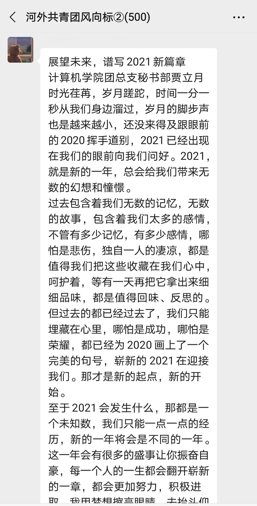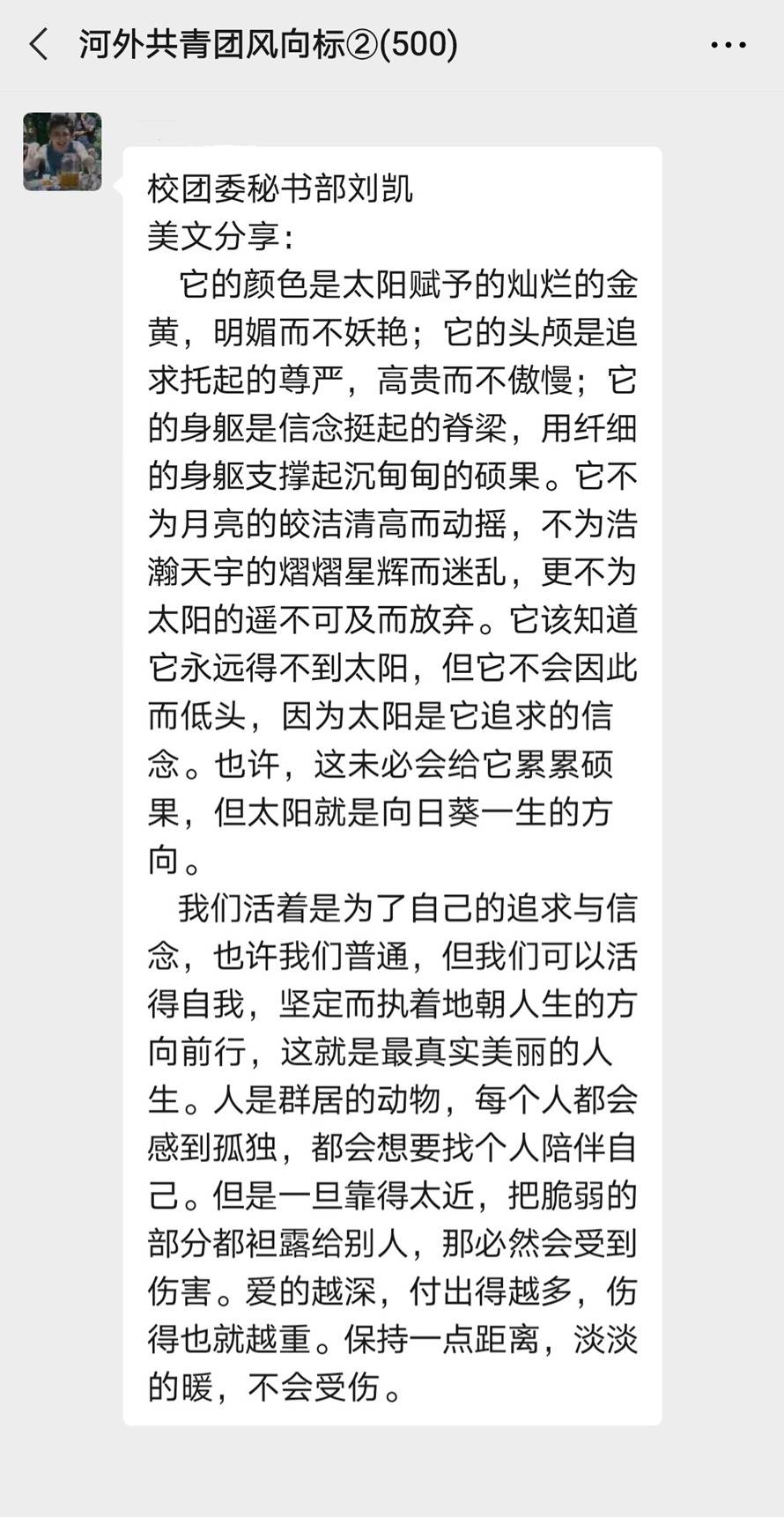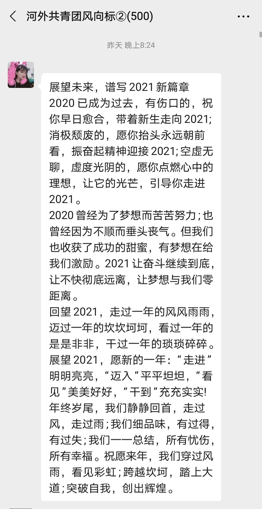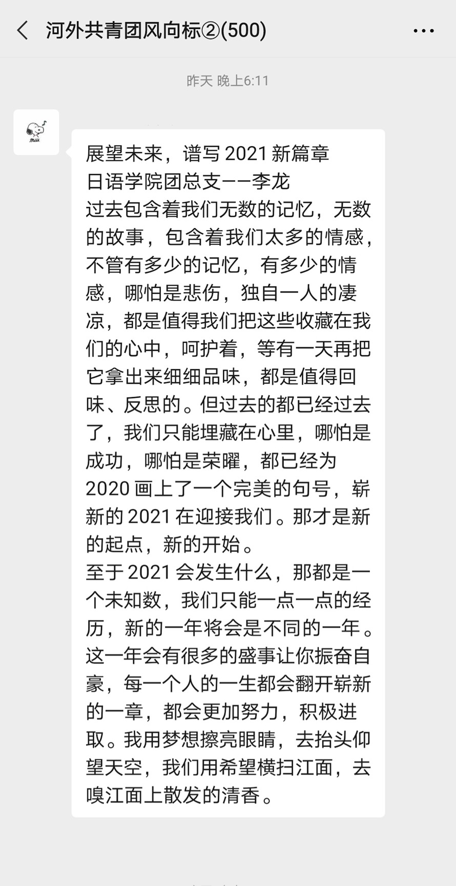 青年之于社会,犹新鲜活泼细胞之在身。作为共青团员的我们不仅要明白肩上的责任,更要在这个特殊时期精进奋斗,与国家同舟共济,共度难关!“学习新思想,争做新青年”这句话不仅仅是口号,作为河外学子,我们要秉承着“专注、坚持、征服”的河外精神奋勇前行,生命不息,学习不止!愿我们今后的日子,似锦旗,如号角,昭示成功。未来将见证着我们用坚持赢得新的“希望”!展望前方,一路辉煌。