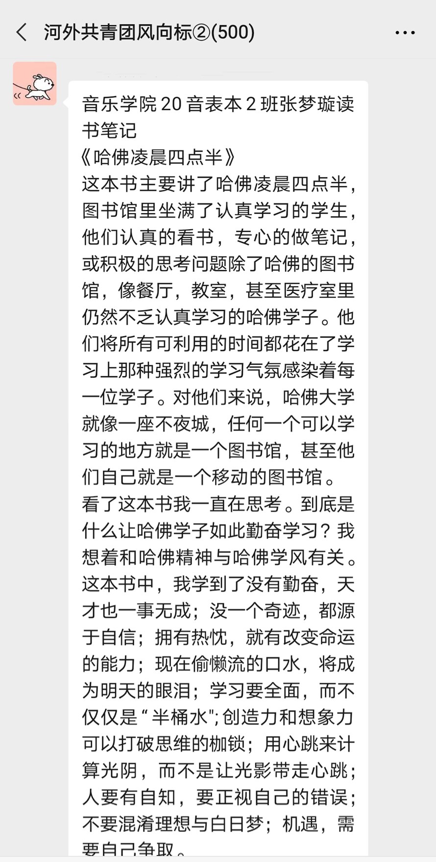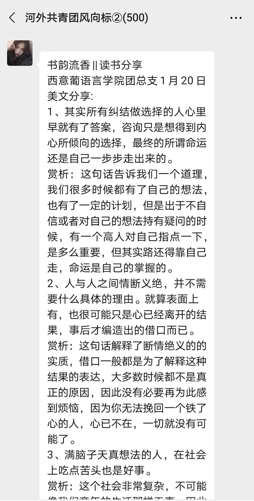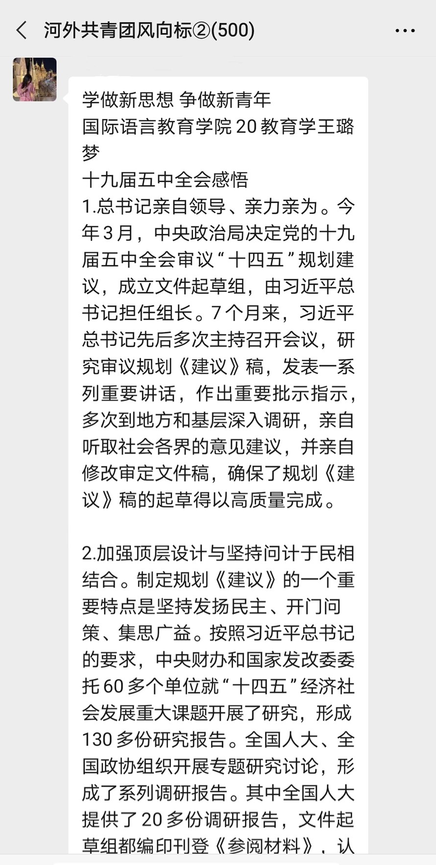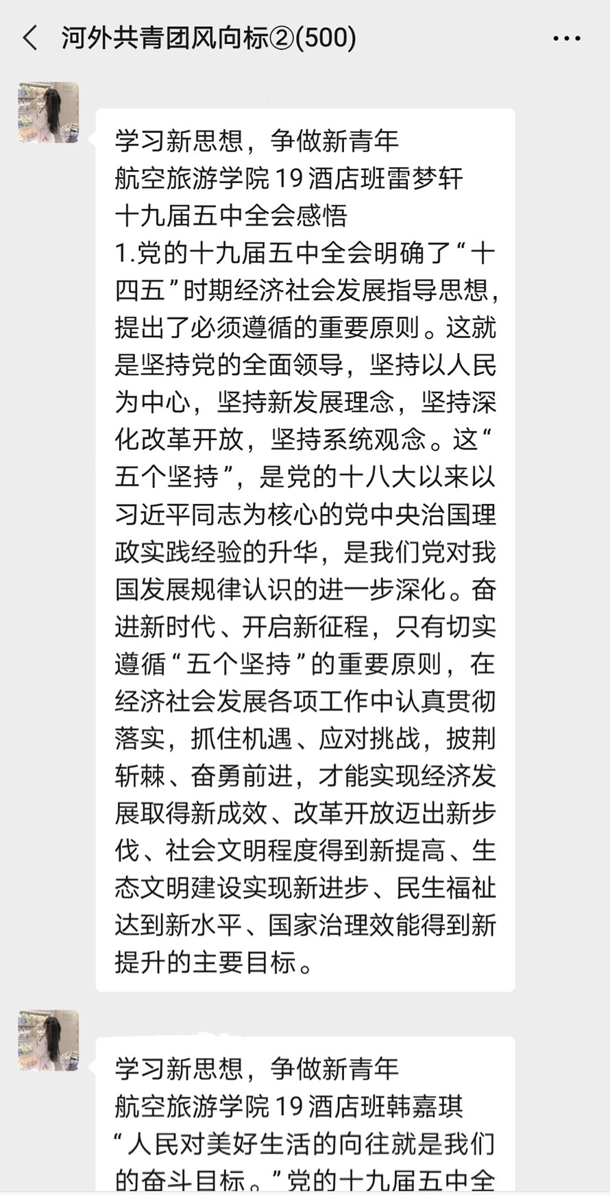 青年之于社会,犹新鲜活泼细胞之在身。作为共青团员的我们不仅要明白肩上的责任,更要在这个特殊时期精进奋斗,与国家同舟共济,共度难关!“学习新思想,争做新青年”这句话不仅仅是口号,作为河外学子,我们要秉承着“专注、坚持、征服”的河外精神奋勇前行,生命不息,学习不止!愿我们今后的日子,似锦旗,如号角,昭示成功。未来将见证着我们用坚持赢得新的“希望”!展望前方,一路辉煌。