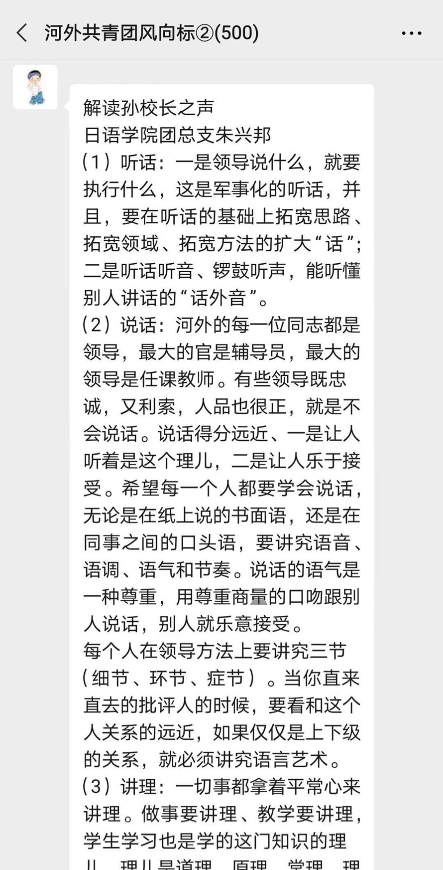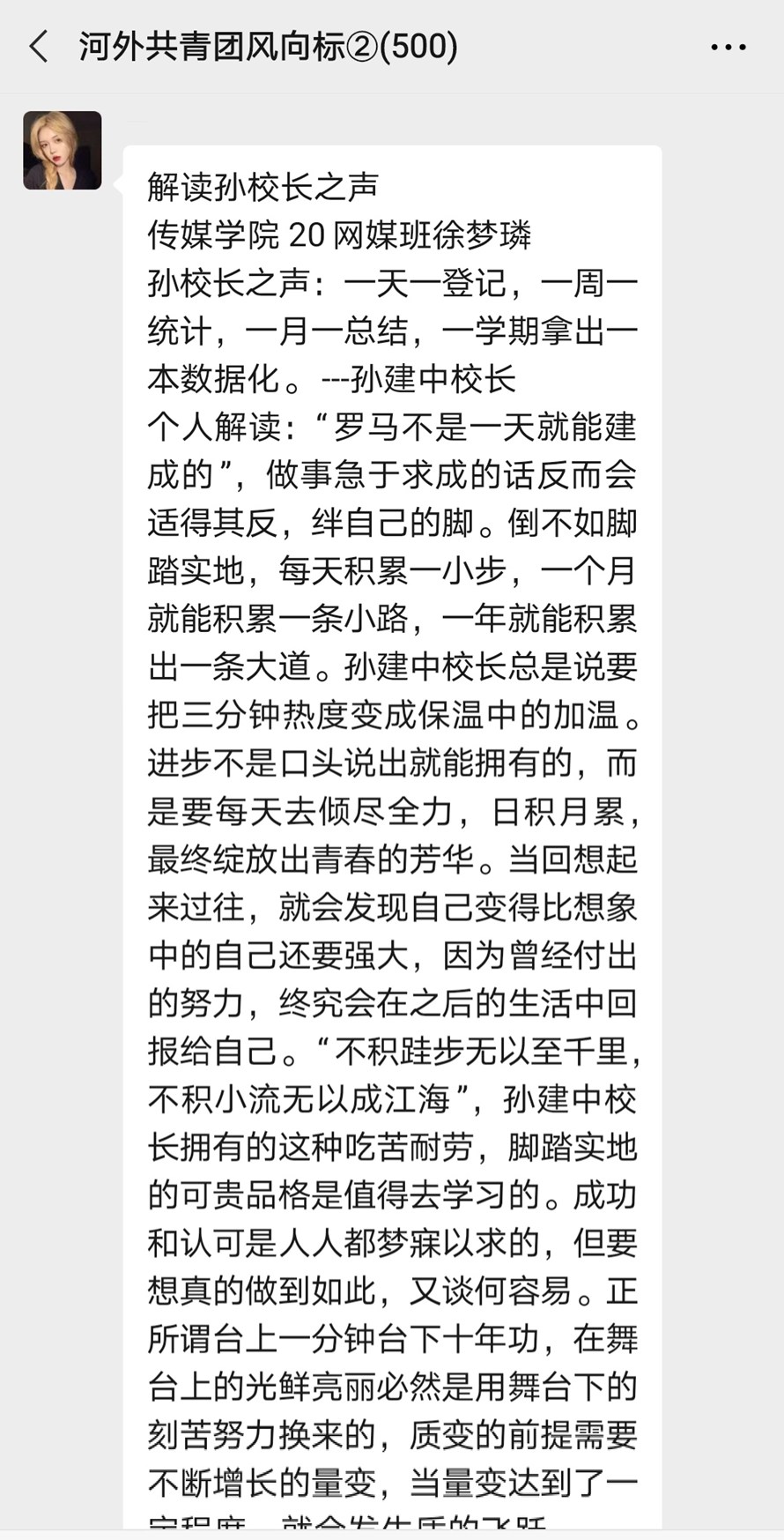 孙校长语录颇为经典实用,其每一句内在的含义也让我们广大河外学子不断学习、不断深思,只为理解其深刻意义。将语录的含义运用到生活实践中,帮助我们提高学习和心理建设的能力。