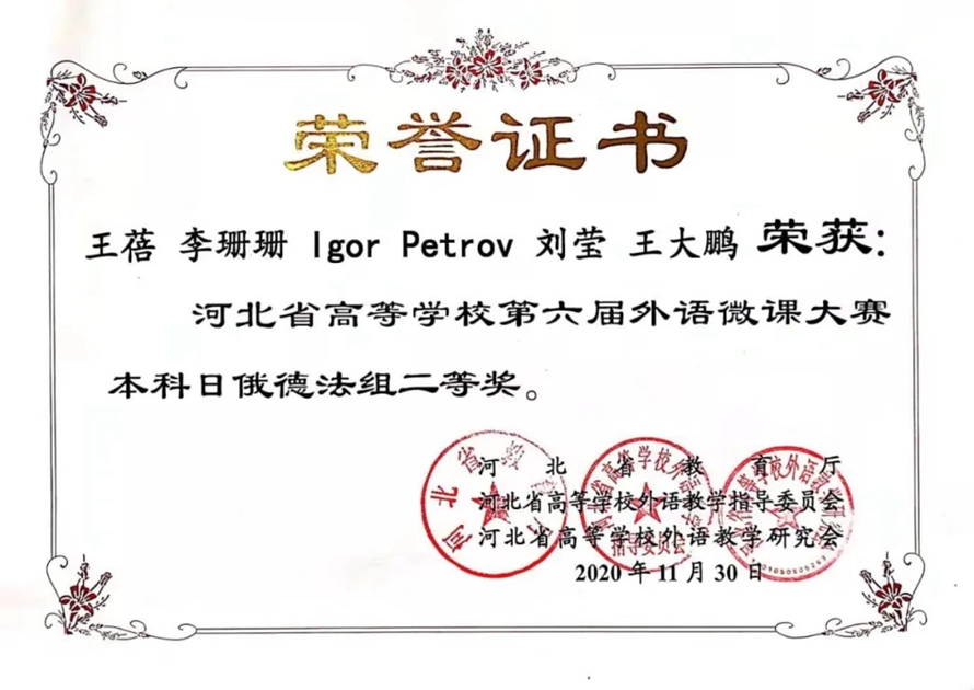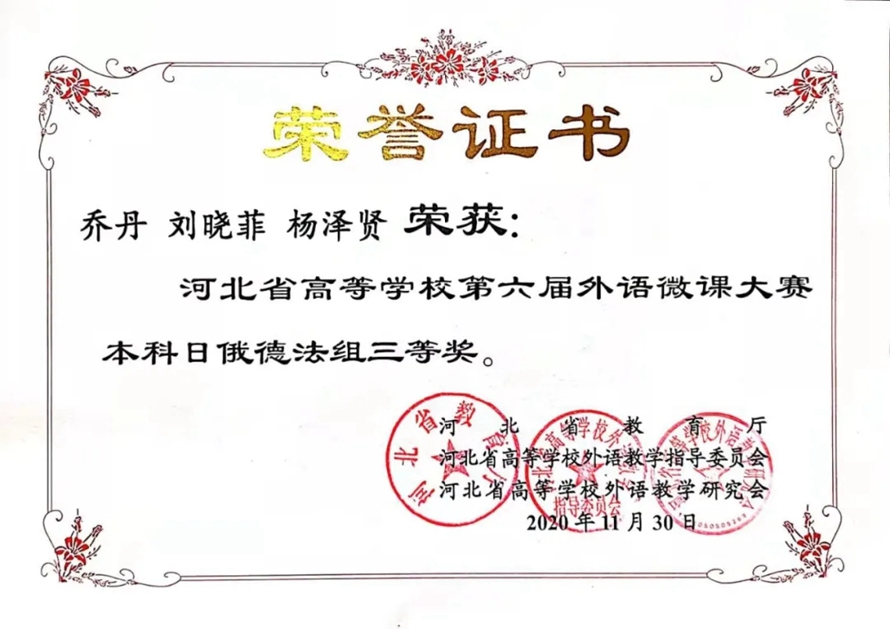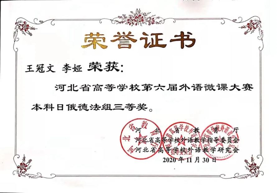 在河北省高等学校第六届外语微课大赛本科日俄德法组复赛中,经过激烈角逐,河北外国语学院欧亚语言学院业务院长王蓓及其团队成员以独特的教学构思与教学成果展示,荣获本科日俄德法组二等奖,日语学院王冠文老师及其团队成员、刘晓菲老师及其团队荣获本科日俄德法组三等奖。