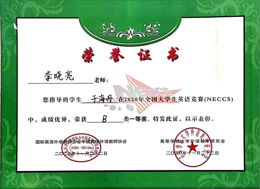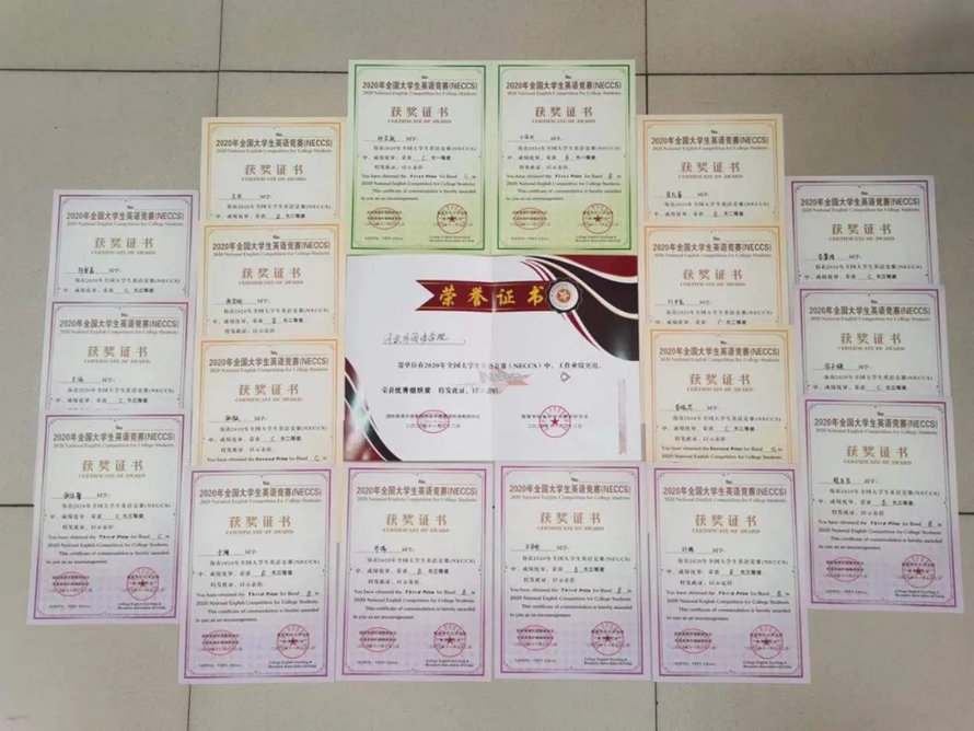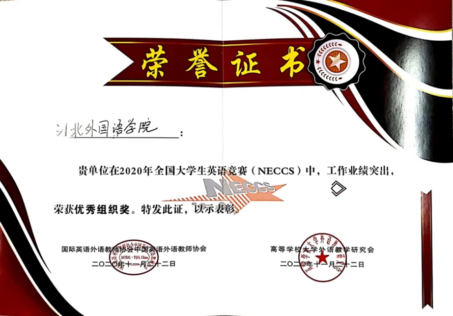 2020年11月,经过院级选拔、校级初赛、省级决赛,河北外国语学院18名同学在全国大学生英语竞赛中喜获佳绩,斩获一等奖2名、二等奖6名、三等奖10名,河北外国语学院荣获优秀组织奖,校委委员、英语学院行政院长李晓亮荣获优秀指导教师奖。