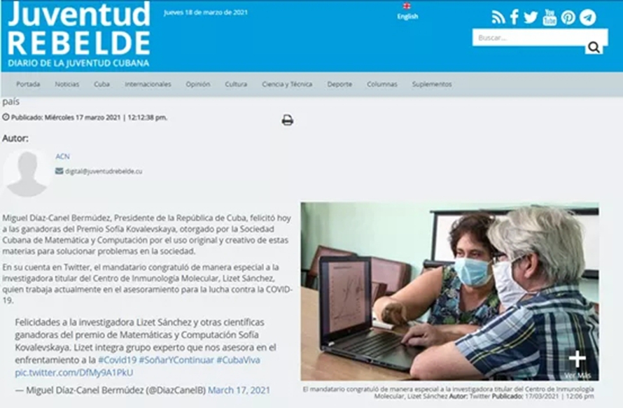古巴共和国国家主席迪亚斯-卡内尔在媒体上发表贺信,祝贺雅伊雷院士获得索菲娅·柯瓦列夫斯卡娅奖。雅伊雷院士对媒体动情地说:“对于我来说,获得该奖是一件非常骄傲的事情,意义重大,说明古巴女性在世界科学研究领域的作用,在该知识领域,要加强人工智能在社会主义建设中的作用,索菲娅·柯瓦列夫斯卡娅是俄罗斯科学家,世界上首位大学女数学教授,代表了妇女在科学发展中的进步和平等”。