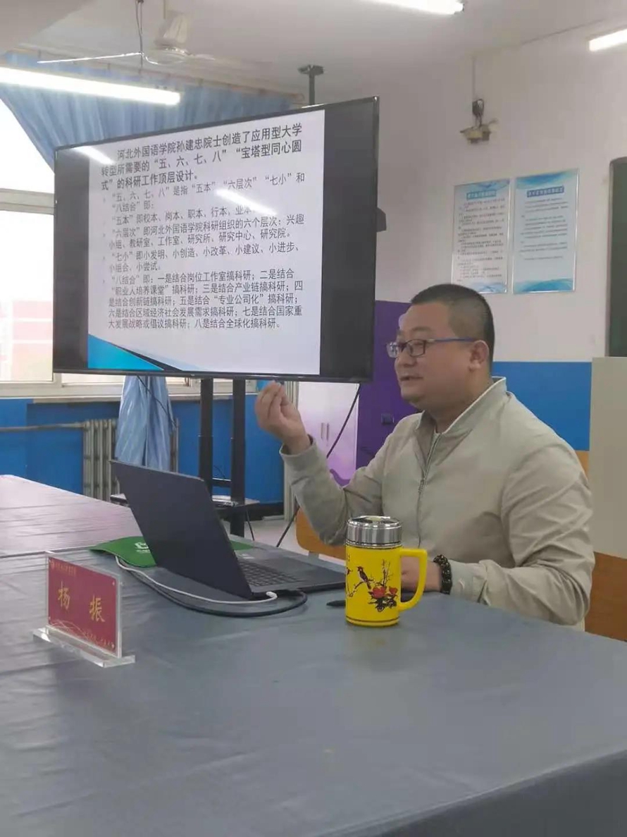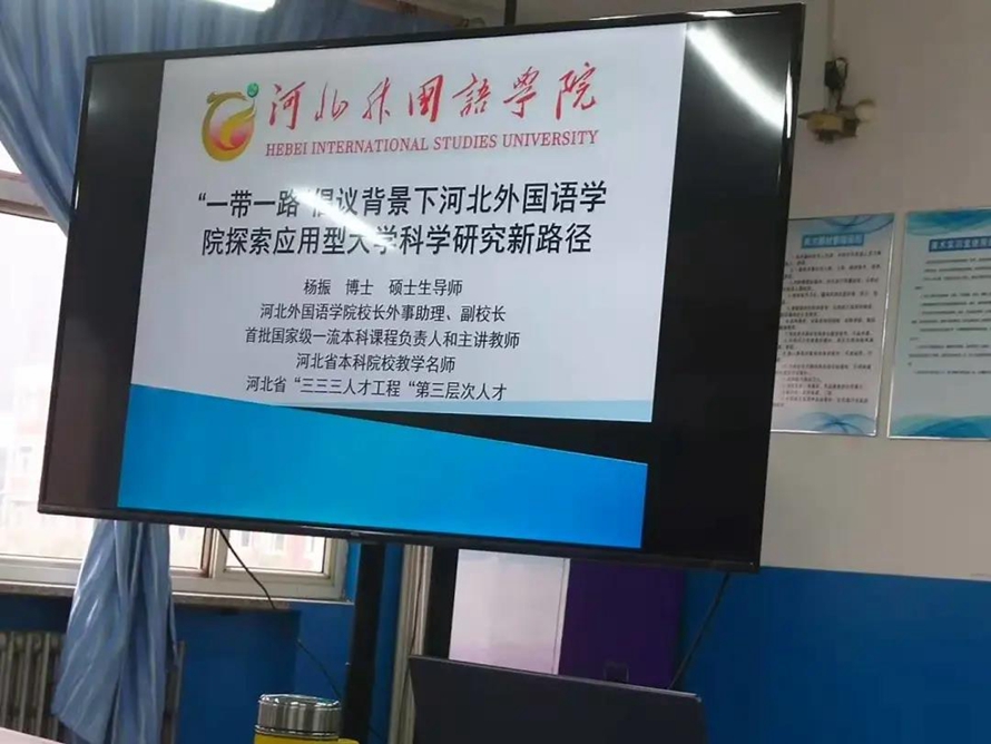 第二项,杨振副校长进行《“一带一路”倡议背景下河北外国语学院探索应用型大学科学研究新路径》主题演讲,他高屋建瓴又脚踏实地,从学校科研工作基本情况、科研对于高校教师的重要性、高校教师开展科研工作遇到的困难、提高高校教师科研水平的建议和措施、重视科研反哺教学、“一带一路”倡议背景下的国别与区域研究六个方面做了深入细致的讲解。