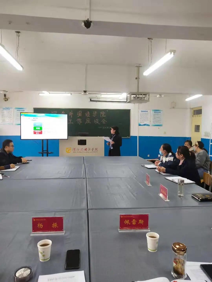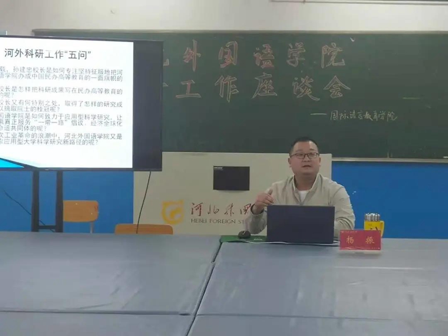 4月1日下午16点30分,由学校科研处组织的科研专题座谈会,在国际语言教育学院419隆重召开。联合国教科文组织国际科学委员会顾问、河北外国语学院副校长、美国纽约科学院外籍院士、古巴科学院功勋院士、古巴历史科学院院士、博士生导师赫苏斯.官切.佩雷斯院士,河北外国语学院校长外事助理、副校长、国家级一流本科课程负责人、河北省“三三三”人才工程第三层次人才、河北省本科院校教学名师杨振博士,科技处处长尹霞,科技处副处长李敏,国际语言教育学院行政院长张红梅,教学院长杨国燕以及全体教师参加了会议。