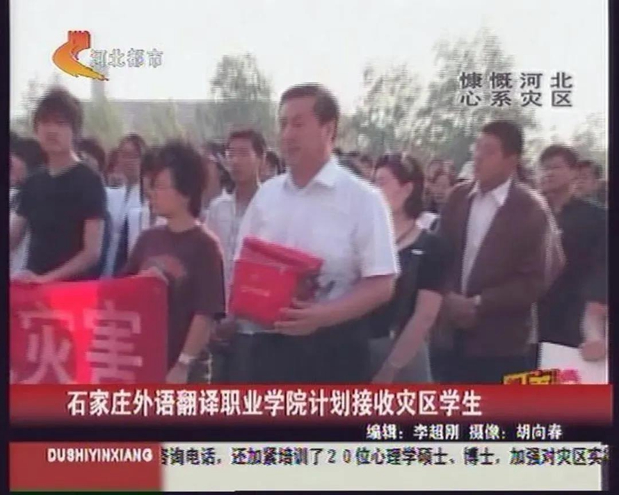 2008年,汶川大地震发生后,河北外国语学院共向灾区捐款22万元,捐赠新购棉被600余床、新购衣物2500余件。汶川地震后第三天,孙校长不顾余震危险,与学校教师志愿者队伍,带着22.3万元善款亲赴灾区,风尘仆仆赶到四川,这是抗震救灾以来,第一个进入灾区进行慰问并实施援助的河北高校,孙建中成为首个走进地震灾区的大学校长。他从灾区带回22名孩子,组建了“汶川儿女班”,学校全免他们的学费、住宿费,每月发放500元补助,逢传统节日发放1000元过节费。该校还招募22个“爱心助学家庭”进行结对帮扶,让这些孤儿感受来自家庭的温暖、来自河北的亲情。