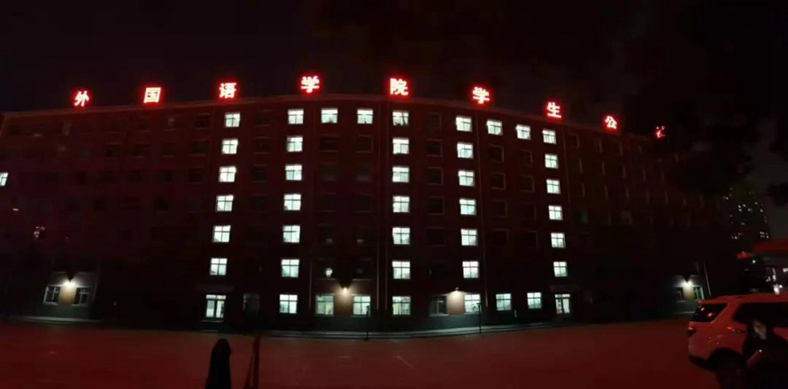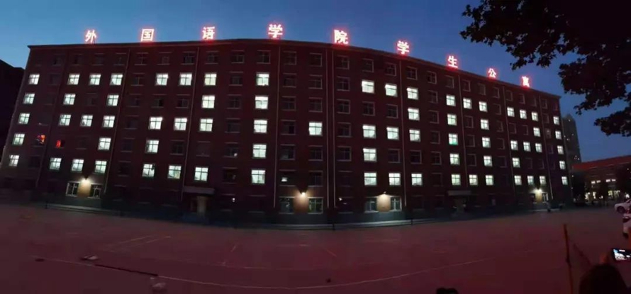河外国际语言教育学院同学们自发组织用宿舍楼一盏盏明亮的灯光,展示“100”、“1921-2021”、“I❤U”等字样,为迎接党的100岁生日送上祝福、献上大礼!