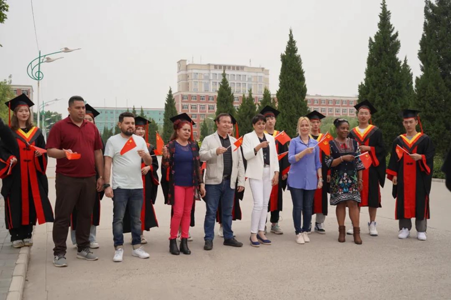外籍专家前来助阵,他们挥舞着手中的五星红旗、党旗,与亲爱的同学们一起,为中国喝彩、为党献上祝福!