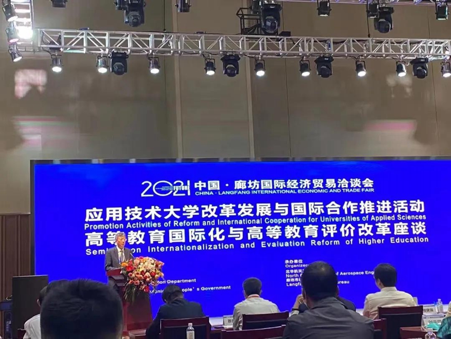 以“构建新格局、开创新未来”为主题的2021年中国·廊坊国际经济贸易洽谈会(以下简称5·18经洽会),于5月18日至21日在廊坊举行。河北外国语学院外事副校长陈伟、国际留学生学院院长韩芳应邀参加5月18日举行的应用技术大学改革发展与国际合作推进会。