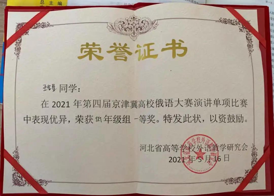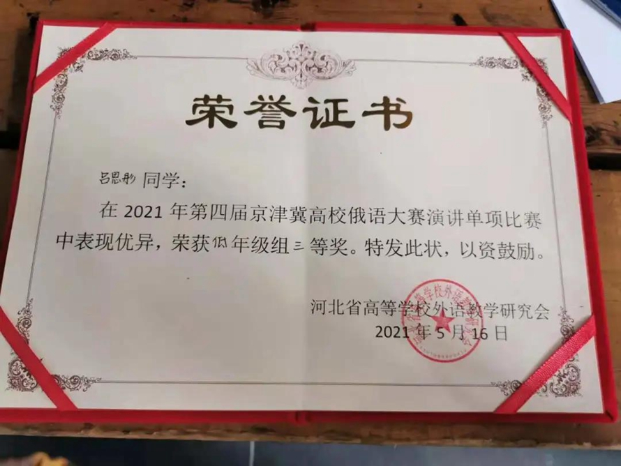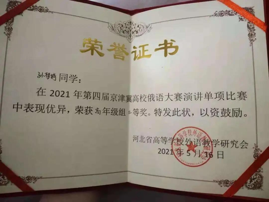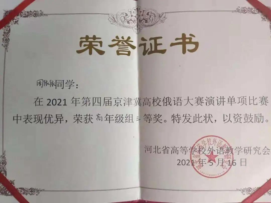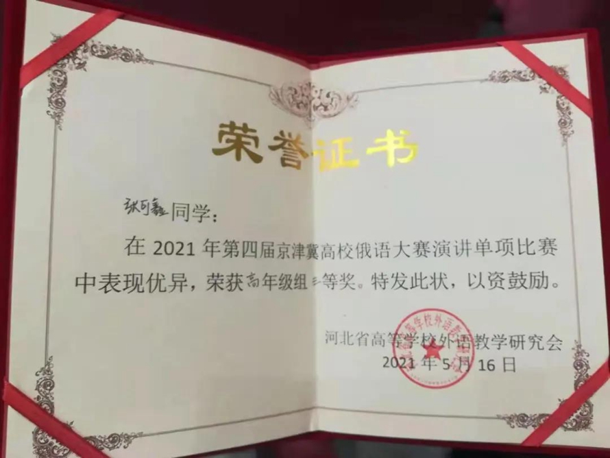 2021年5月16日,第四届京津冀高校俄语大赛如期举行。在此次大赛演讲单项比赛中河北外国语学院欧亚语言学院19级俄本一班王金星获得低年级组一等奖、19级俄本一班郭绍涵获得低年级组二等奖、19级俄本一班吕思彤获得低年级组三等奖,18级俄本一班张可鑫、18级俄本二班周依依、18级俄本一班孙梦婷均获得高年级组三等奖。