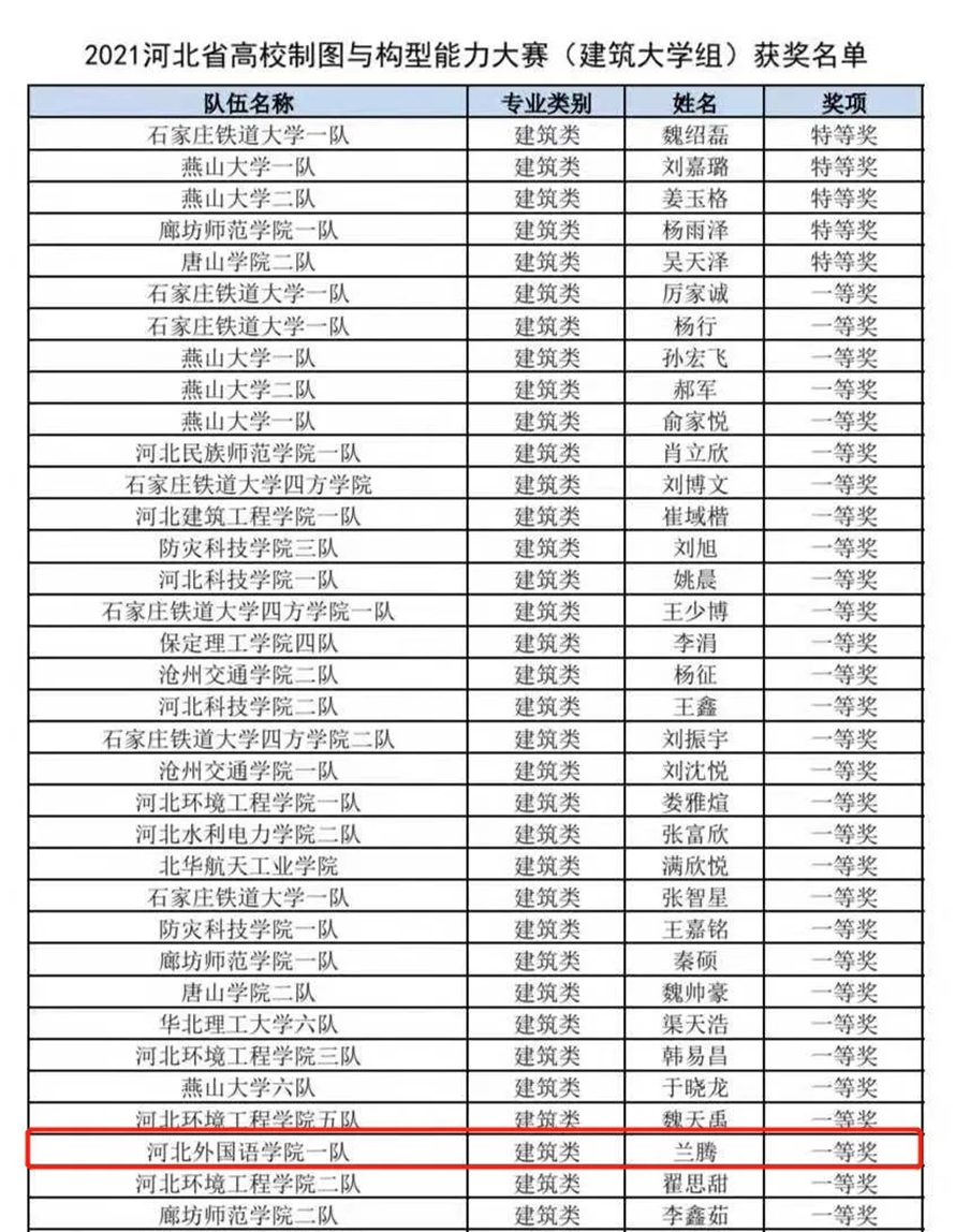 2021年5月29日,在王婷、李静文两位老师的带领下,河北外国语学院涉外建筑工程学院李宁、兰腾、周立民、殷旺、张园5名同学参加“2021河北省高校制图与构型能力大赛”,并斩获建筑大学组1个一等奖、2个二等奖、1个三等奖!