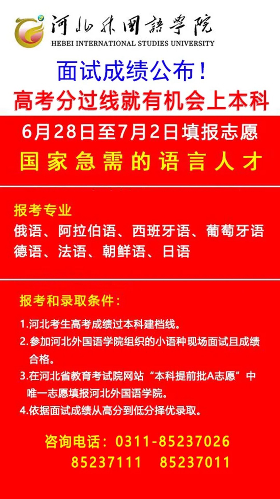 通知:河北外国语学院小语种本科提前批28日以前的面试成绩都已全部公布,请各位考生及时查询成绩,并且抓紧时间在河北考试院官网上填报本科提前批A志愿,切勿错过填报时间。