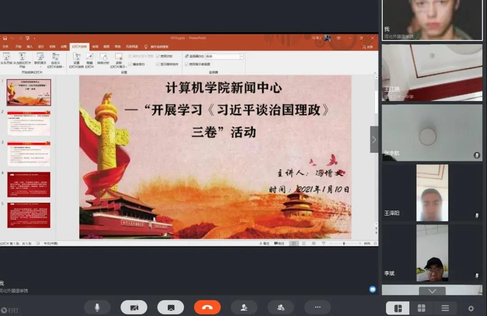 河北外国语学院坚持用习近平总书记重要著作和系列讲话精神武装头脑,将其作为师生思想政治教育的重要教材,推动相关内容进教材、进课堂、进师生头脑。学校在全国范围内首次将学习习近平新时代中国特色社会主义思想纳入思政课程体系,以最新出版的《习近平谈治国理政》(三卷)为教材,组织全校两万余名学生进行深度学习和研讨,在师生中引起强烈反响,迅速掀起学习热潮。并在寒假期间,连续开展学习《习近平谈治国理政》和《党史》系列活动,受到广泛家长和社会各界的广泛赞誉。