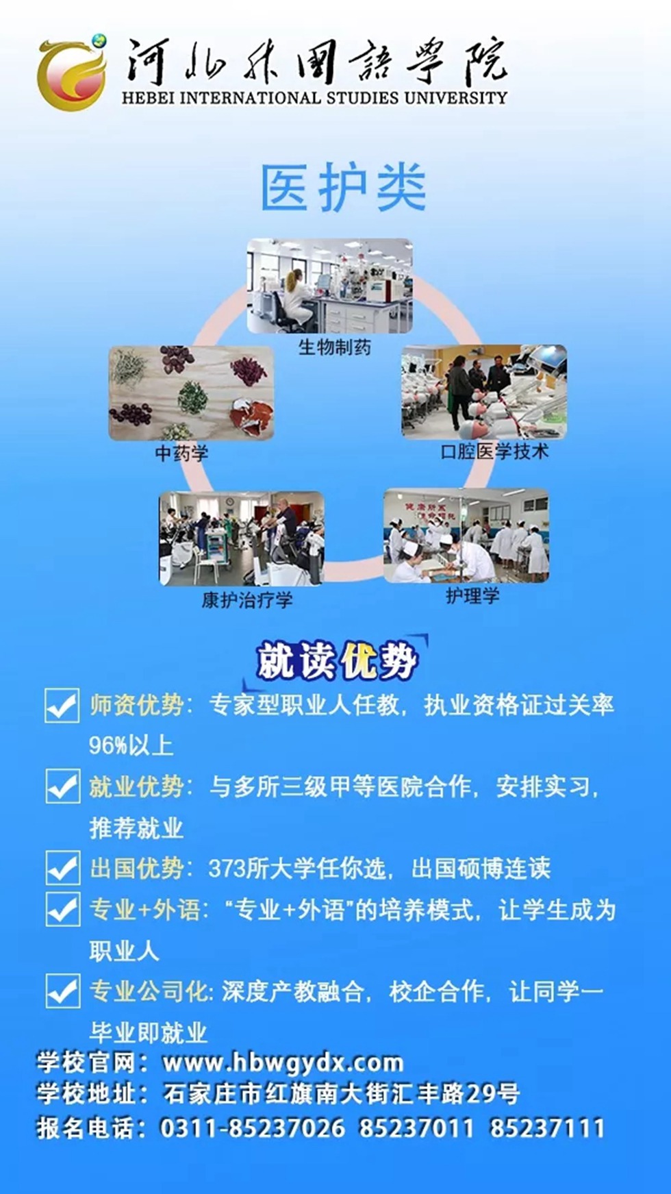 河北外国语学院国际医学院护理学专业毕业生近三年平均就业率均在98%以上,对口就业率在75%以上,四六级过级率在60%以上,护士资格证过级率在95%以上。10余届毕业生中就业的单位有北京大学人民医院、北京首都医科大学附属医院、北京友谊医院、北京航天总医院、北京市武警医院、中国人民解放军301医院、天津市人民医院、天津南开大学附属医院、上海和睦家医院、上海市仁济医院、上海市第十人民医院等。