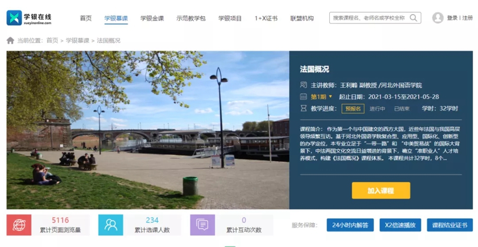 2月底,河北外国语学院省级在线精品开放课程《法国概况》在学银在线平台正式上线!该课程由河北外国语学院德法语言学院业务院长王利峰副教授主讲,李静、蔡玉玲、于洋、翟佳鼎力参加,于2021年3月15日正式开放。