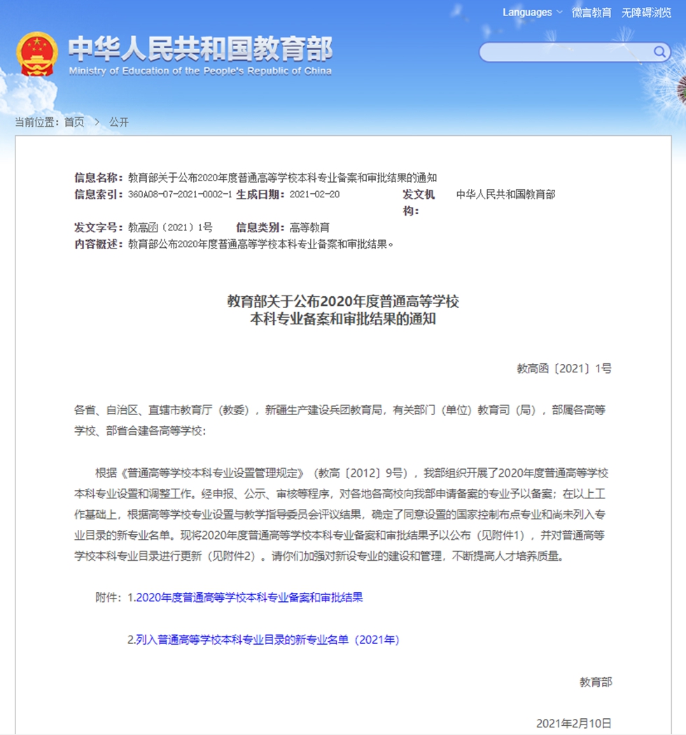2月下旬,教育部下发《教育部关于公布2020年度普通高等学校本科专业备案和审批结果的通知》(教高函〔2021〕1号),河北外国语学院信息与计算科学、会展经济与管理、美术学、国际经贸规则、区块链工程等5个专业入选新增备案本科专业名单,进一步优化了河北外国语学院学科专业结构布局,这些专业将于2021年开始招生。截至目前,河北外国语学院本科专业已达到52个。