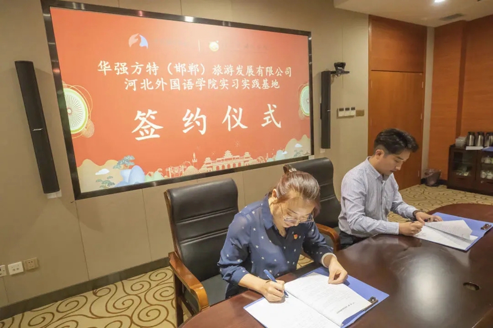 河北外国语学院航空旅游学院行政院长白惠与华强方特(邯郸)旅游发展有限公司副总经理李宗伟签署“产、学、研”合作办学培养协议书。
