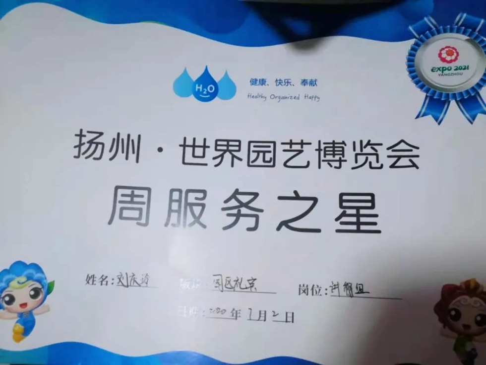刘庆玲说:“非常荣幸担任扬州世园会志愿者,在这里,我收获了很多的经验,了解到了许多扬州的人文历史和当地的风俗习惯,也对中国历史的地理分布和中国历史的人文景观有了更深入的了解。来到这里我从来没有后悔过,只觉得流连忘返,不虚此行!”