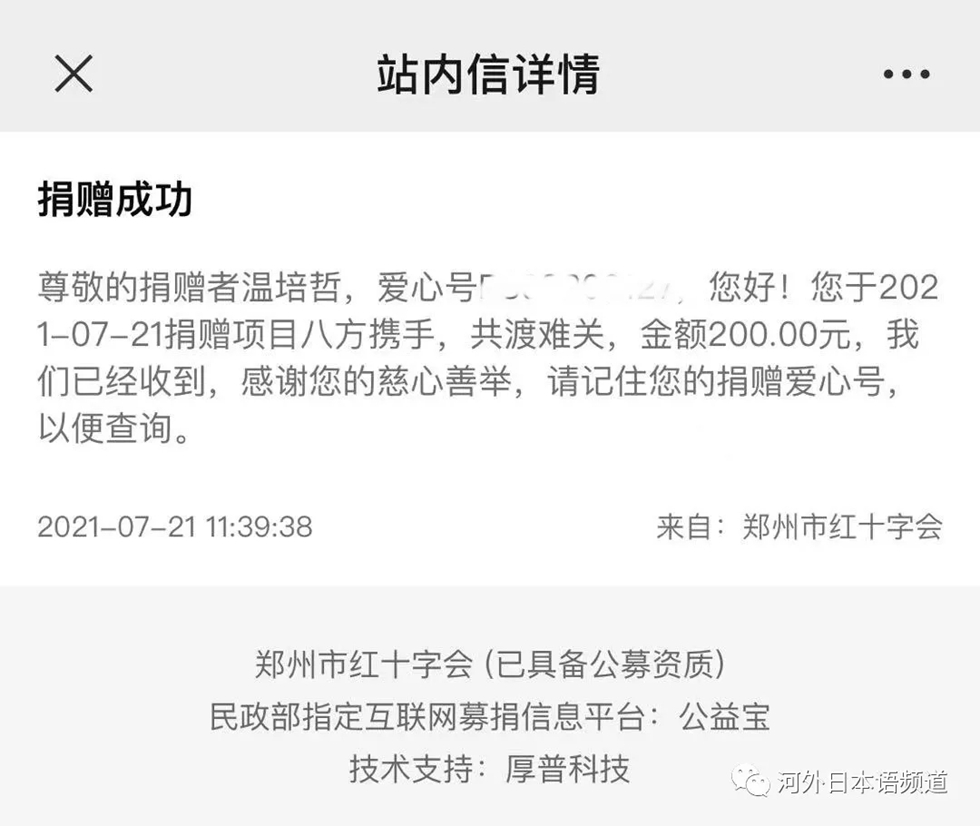 作为一名学生党员,河北外国语学院日语学院2018级本科一班温培哲同学,通过微博了解到向郑州红十字会捐款的途径,决定用自己兼职挣的钱给红十字会捐款,助力河南。她说,虽然自己能力有限,但是也希望尽一份绵薄之力,愿河南人民早日渡过难关。