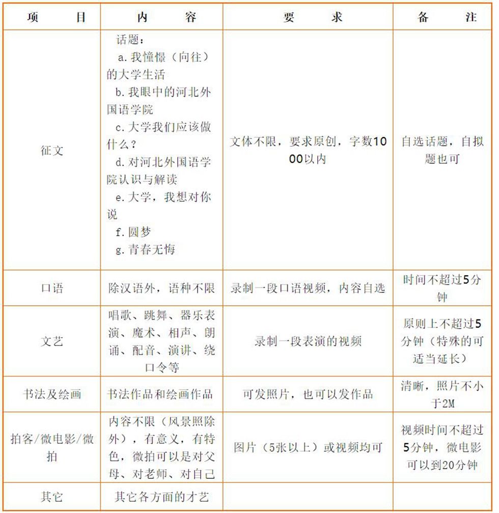 五、注意事项:参赛者统一将作品发至: 1023120332@qq.com邮件命名为:姓名+学院+专业+参赛项目截止日期:即日起至2021年9月10日本次大赛解释权归学院党委宣传部,电话:0311-85238376