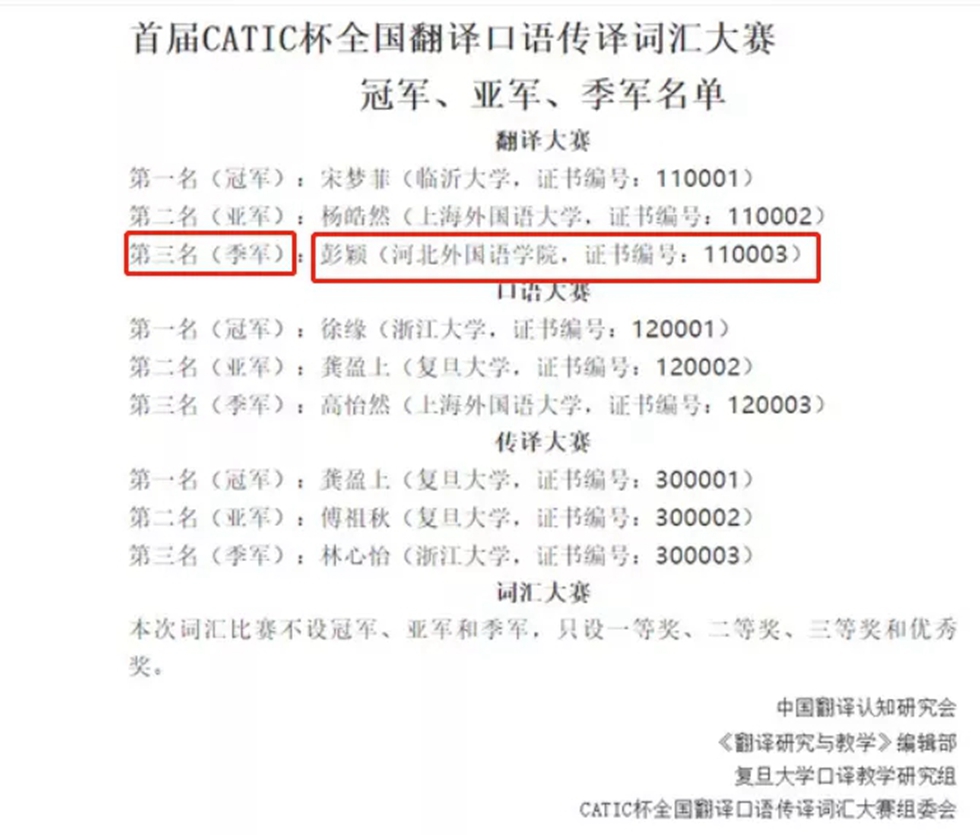 近日,喜讯传来,河北外国语学院英语学院20级英本五班彭颖同学在首届CATIC杯全国翻译传译口译词汇大赛中,荣获翻译大赛季军。