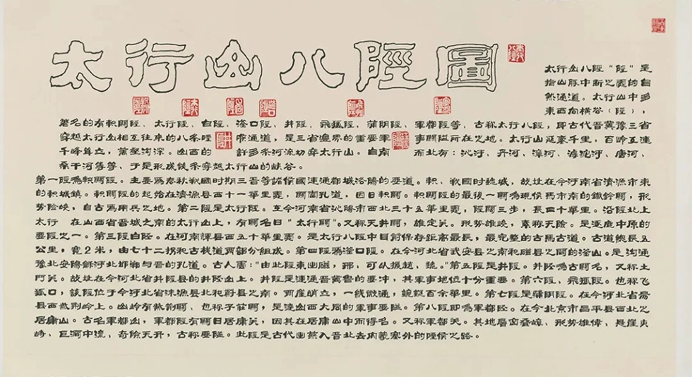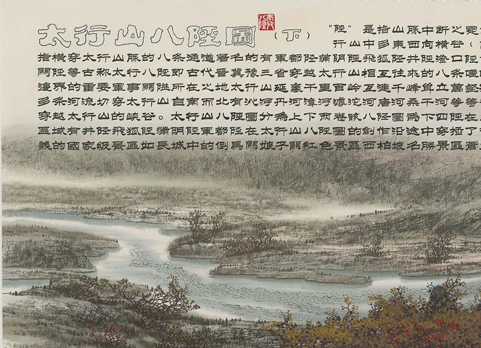 艺术家吴柳东的作品《太行山八陉图》所描绘的八陉(音xíng)分别为军都陉、蒲阴陉、飞狐陉、井陉、滏口陉、白陉、太行陉、轵关陉古称太行八陉,即古代晋冀豫三省穿越太行山相互往来的八条咽喉通道,是三省边界的重要军事关隘所在之地。从地理上看这幅《太行山八陉图》所描绘的太行山是延袤千里,百岭互连,千峰耸立,充满着万壑沟深的壮丽山川,而山西的许多条河流切穿太行山,自南而北有:沁河、丹河、漳河、滹沱河、唐河、桑干河等等,于是形成几条穿越太行山的峡谷。