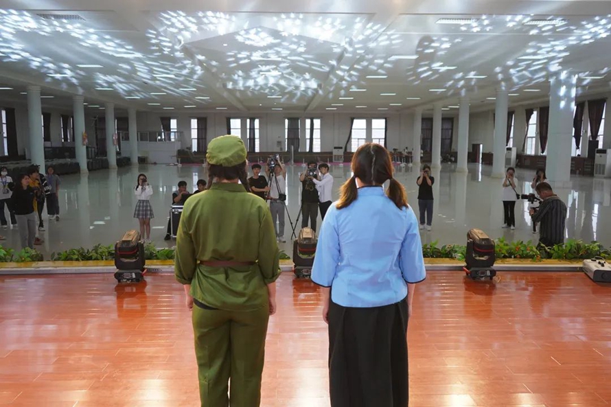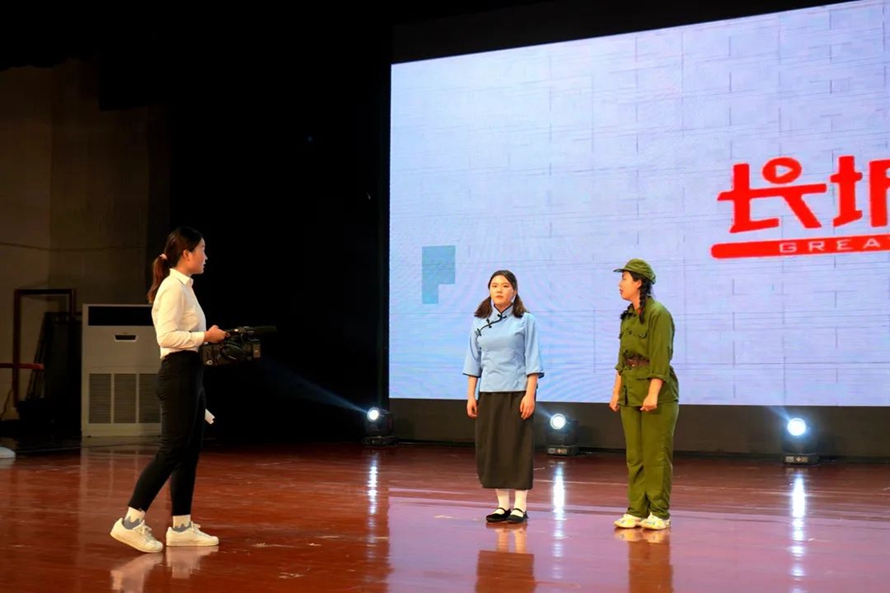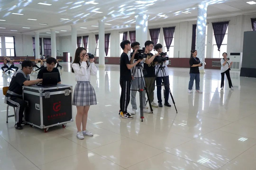 传媒学院摄影摄像、编导、播音主持等专业的同学们在学生活动表演实训场地进行实践教学