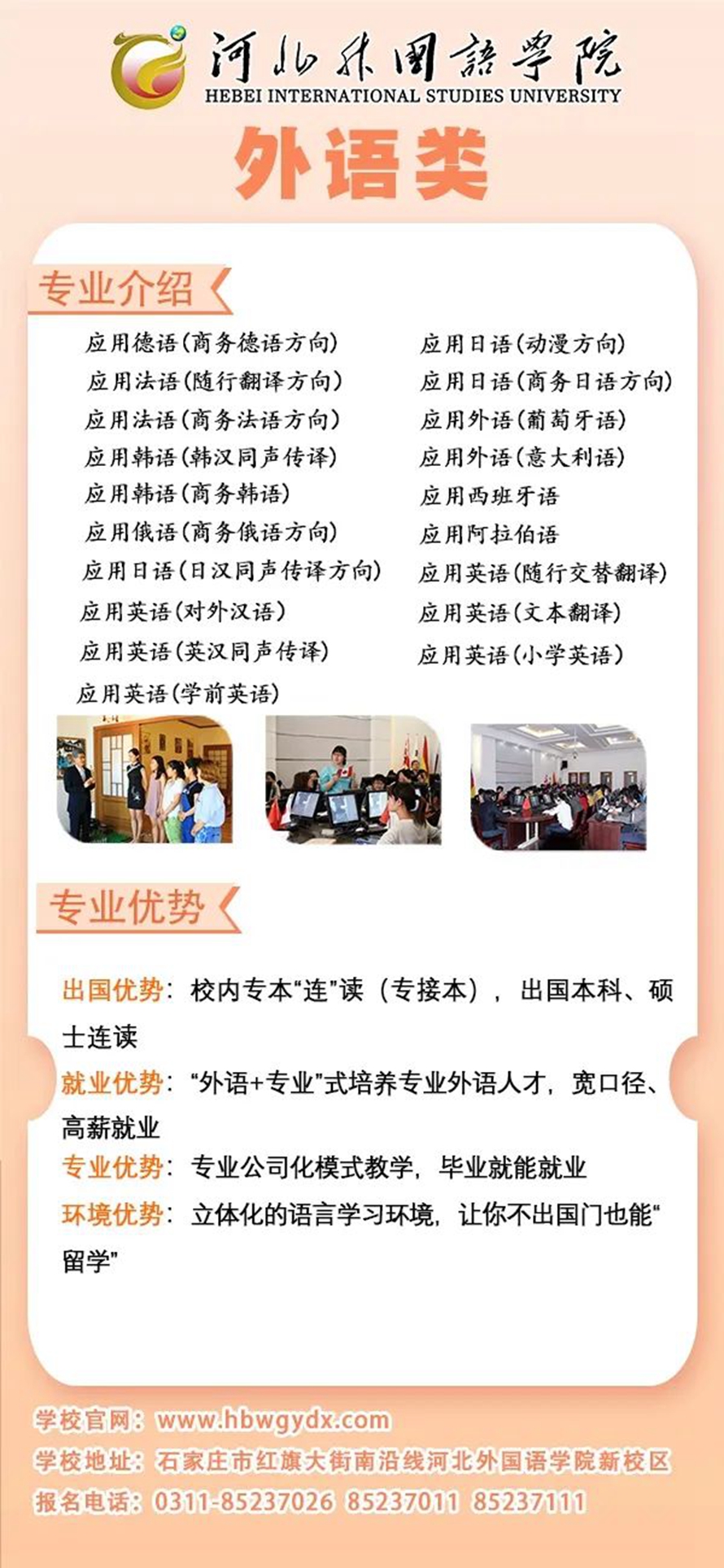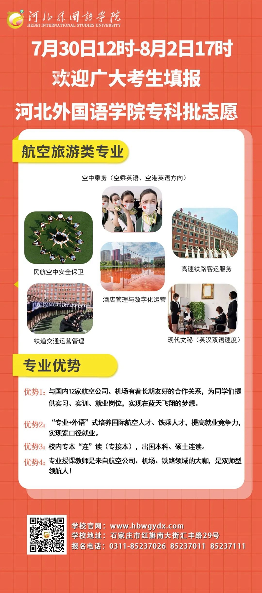 7月30日12时至8月2日17时,专科提前批、专科批、对口专科批将进行志愿填报,欢迎广大考生第一志愿填报河北外国语学院。