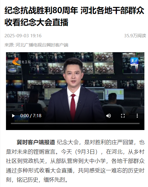 河北广播电视台冀时客户端: 纪念抗战胜利80周年 河北各地干部群众收看纪念大会直播 https://web.cmc.hebtv.com/cms/rmt0336_html/19/19js/zx/lbhj/12000053.shtml?share=true