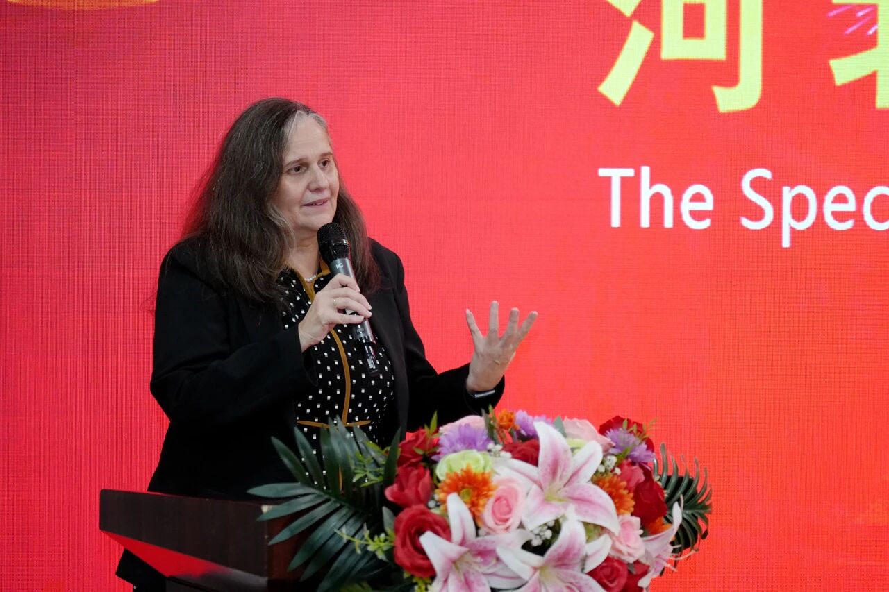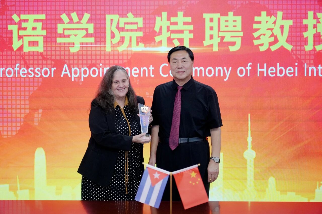 在签约仪式上,河北外国语学院副董事长、执行校长习伟教授宣读《河北外国语学院董事会关于聘请梅德赛德斯·德尔加多为特聘教授的决定》。孙建忠院士为梅德赛德斯校长颁发“中国·河北外国语学院特聘教授”奖杯及聘书。