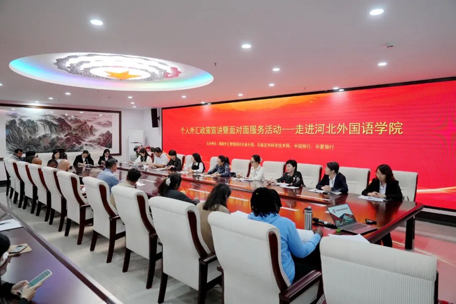 9月23日下午,由河北省外汇管理局、石家庄市科学技术局等部门主办的“服务高校行”个人外汇政策宣讲暨面对面服务活动,在河北外国语学院成功举办。国家外汇管理局河北省分局安睿处长、石家庄市科技局外国专家管理科副科长谢芳,中国银行、华夏银行负责外汇业务的相关代表,以及河北外国语学院的外籍教师出席活动。河北外国语学院的十三位外籍教师准时到达活动现场,积极参与现场互动,在会上与活动主办方进行了充分有效的交流。
