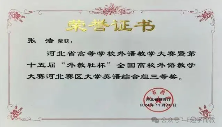 作为省级高规格教学赛事,“外教社杯” 大赛是检验高校外语教学水平的重要平台。张浩老师的获奖,不仅是对其个人教学能力的权威认证,更彰显了河北外国语学院在外语教学领域的深耕成果。