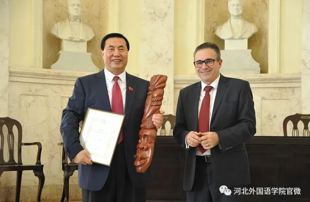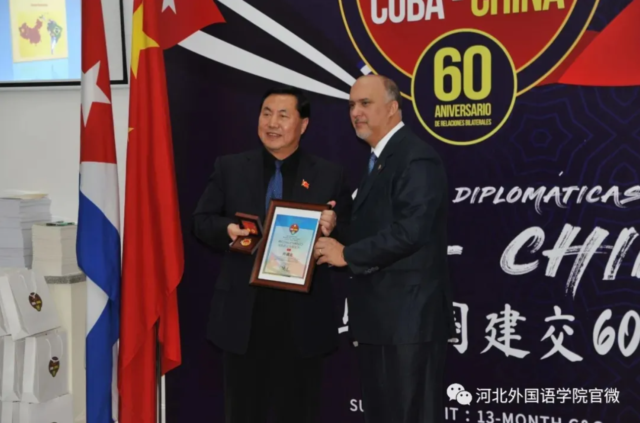 古巴驻华大使卡洛斯·米格尔·佩雷拉·埃尔南德斯向河北外国语学院董事长、校长孙建忠院士颁发“中古建交60周年荣誉证书”及“中古建交60周年纪念章”