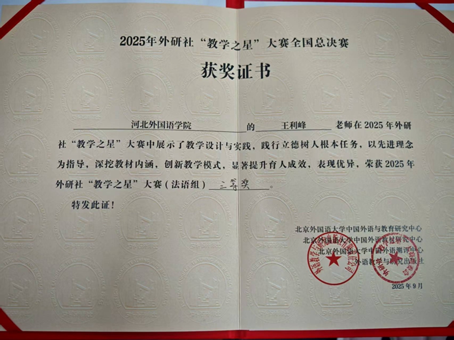 近日,2025 年外研社 “教学之星” 大赛法语组全国总决赛落下帷幕。河北外国语学院德法语言学院业务院长王利峰凭借扎实的专业功底与创新的教学设计,从全国晋级总决赛的 11 名优秀法语教师中脱颖而出,荣获全国三等奖,为学校赢得荣誉,也展现了河外法语教学的过硬实力。