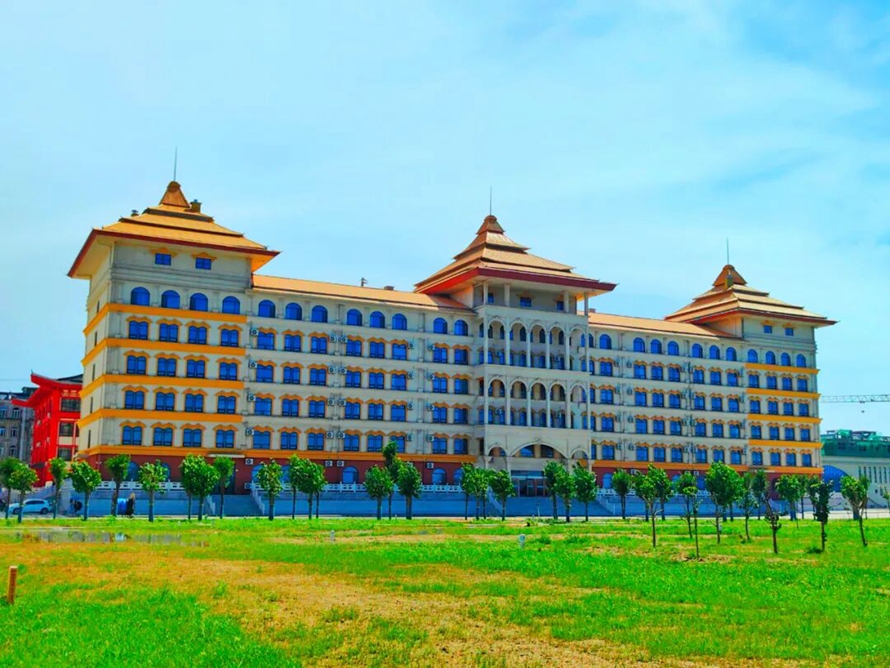 教学楼群错落分布在校园里。汉唐教学楼的朱红立柱衬着黛瓦,飞檐透着中式雅致;旁边的云贵教学楼藏着东南亚风情,不张扬的金黄屋顶、门口的精致廊柱,再加上成排亮窗,晴天时映着蓝天绿草,路过时总让人忍不住多看两眼。