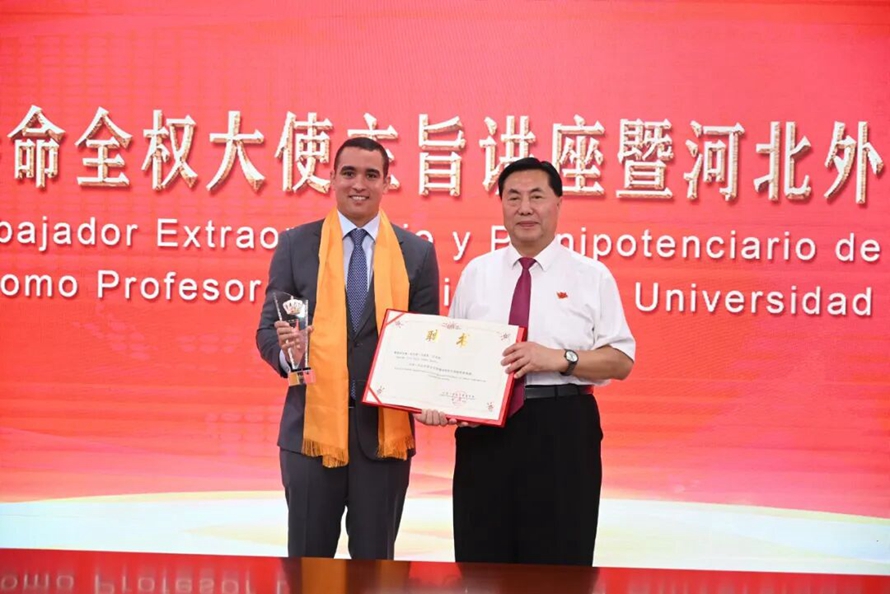 随后,在学校各级领导及全校师生的共同见证下,河北外国语学院董事长、校长孙建忠院士代表学校正式聘请戈麦斯大使为特聘教授。孙建忠院士亲自向戈麦斯大使颁发荣誉奖杯与聘书,并表示,大使的加入将为学校国际化人才培养提供宝贵资源,有力推动中多教育合作向更深层次、更实领域发展。