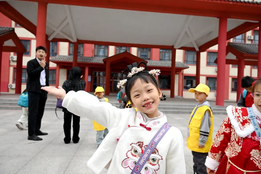 行至汉唐楼,建筑风格陡然一变。古色古香的飞檐斗拱、朱柱黛瓦将孩子们带入唐风汉韵的氛围之中。身着汉服的小记者们与建筑相映成趣,展现出浓厚的传统文化气息。接着,小记者们参观了以黄白为主色调的云贵楼。讲解员介绍,这座建筑融入了云南地域特色,体现出我国多民族文化的多样与共融,激发了孩子们了解不同地域文化的兴趣。途中,大中华办公楼同样引起了大家的注意,该建筑沿袭了故宫的建造风格,红墙黄瓦、气势恢宏,又有汉唐楼与之相互呼应,展示了中华传统建筑的庄重与魅力。大家兴致高涨,不少孩子选择在大中华前拍照留念,留下与古建的美好合影。