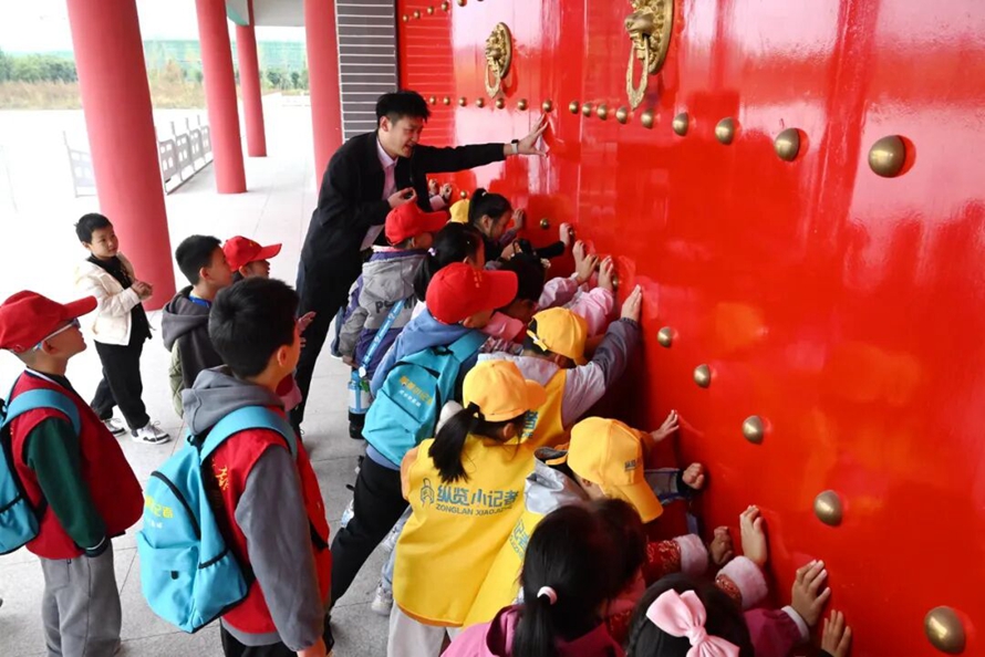 最后一站,小记者们来到红墙蓝瓦的封龙书院大学堂。讲解员带领大家推开厚重的木门,进一步体验古代学堂的氛围。