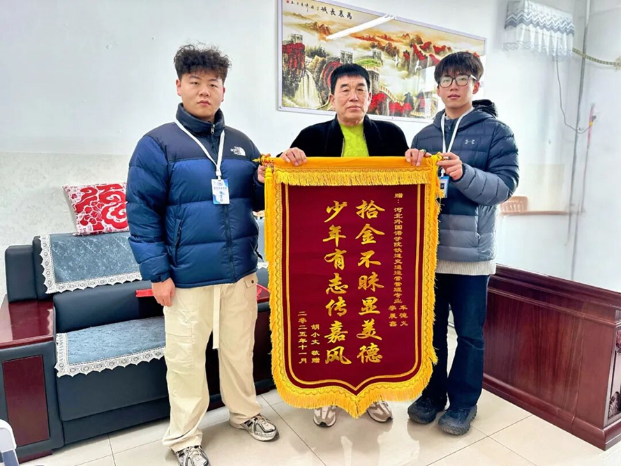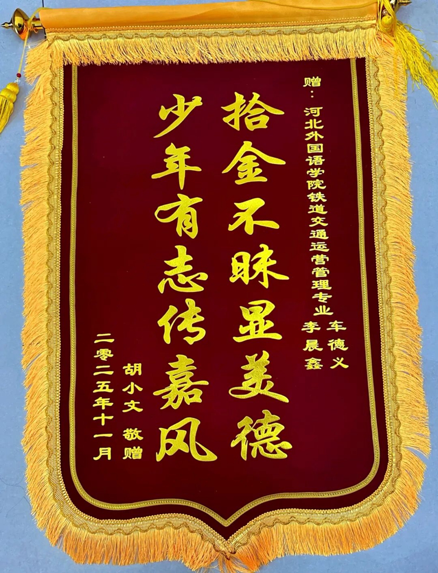 11月17日清晨,河北外国语学院国际航空旅游学院办公室内暖意流淌。市民胡先生携家人专程送来一封感谢信与一面印着“拾金不昧品德高 立德树人育英才”的锦旗,恳请学院负责人转交2024级铁道交通运营管理专业的李晨鑫、车德义两名同学,以表敬意。