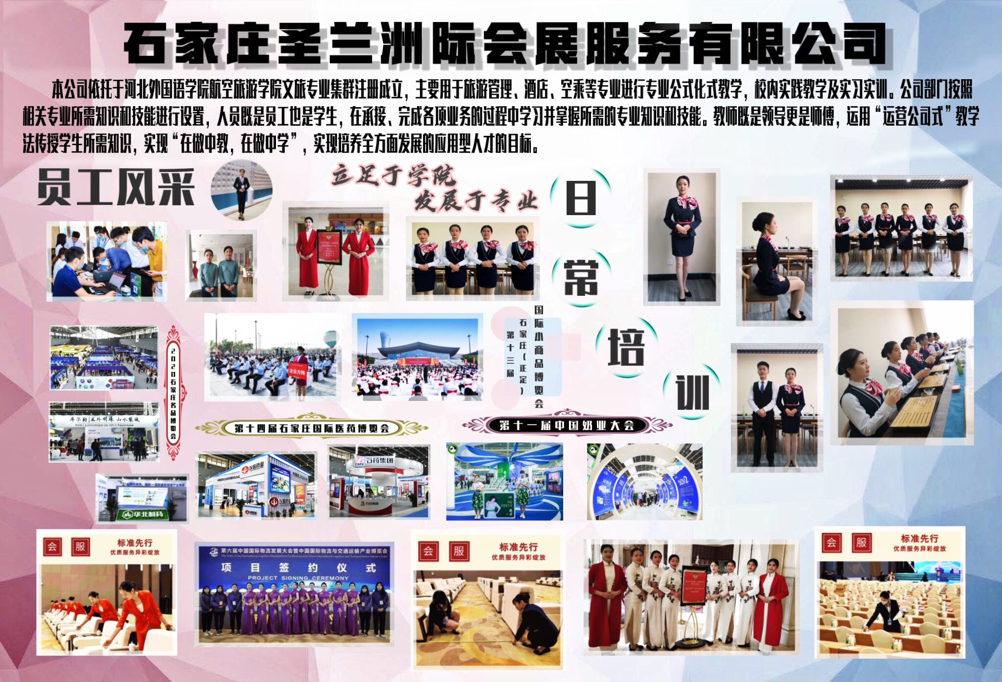 河北外国语学院以酒店管理专业为依托,成立了石家庄圣兰洲际会展服务有限公司。有雄厚的人才保障、设备保障、资源保障、场地保障等。