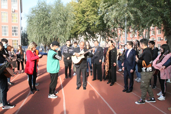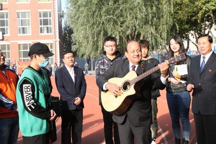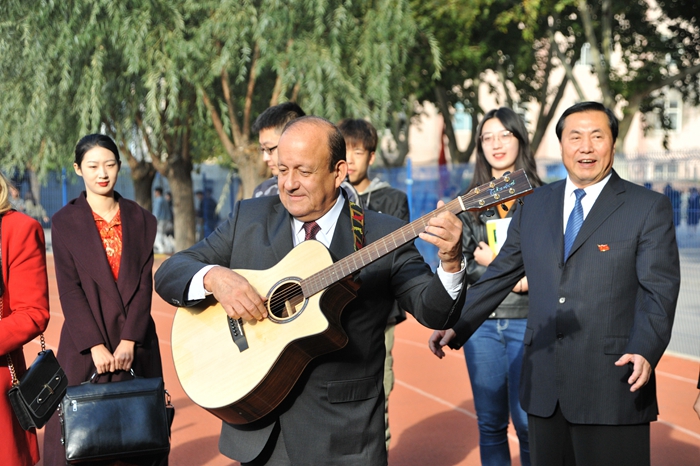 看到音乐学院的师生在练习器乐,大使先生禁不住接过一把吉他表演起来,他说:“看到这些可爱的孩子们,我也想回到学生时代,重新体验到做学生的乐趣。”