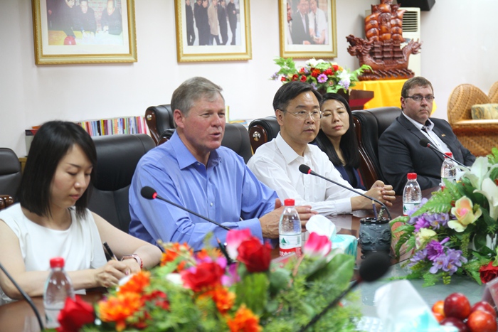首先,朱红素校长对新不伦瑞克省副省长一行的到来表示了热烈欢迎,并就省外办长久以来对河北外国语学院的支持表示了衷心的感谢。朱校长向霍斯曼副省长一行介绍了河北外国语学院的基本情况。作为河北省唯一一所独立设置的本科外国语大学,河北外国语学院快速发展,已与世界50多个国家的197所大学开展了多层次的合作,目前已有在校生16000余人,开设了48个语种,河外英法专业群经过十几年的发展,在校生已达2000余人,法语专业在校生近1000人,学校为促进中加两国经济发展和友好往来发挥了语言桥梁作用。朱校长表示,中加两国虽相隔万里,但借助语言与现代化通讯工具,又让两国近在咫尺,霍斯曼副省长一行的到来,必将推动促进河北外国语学院与加拿大高校在英语、法语、护理、管理、教育等领域的合作。