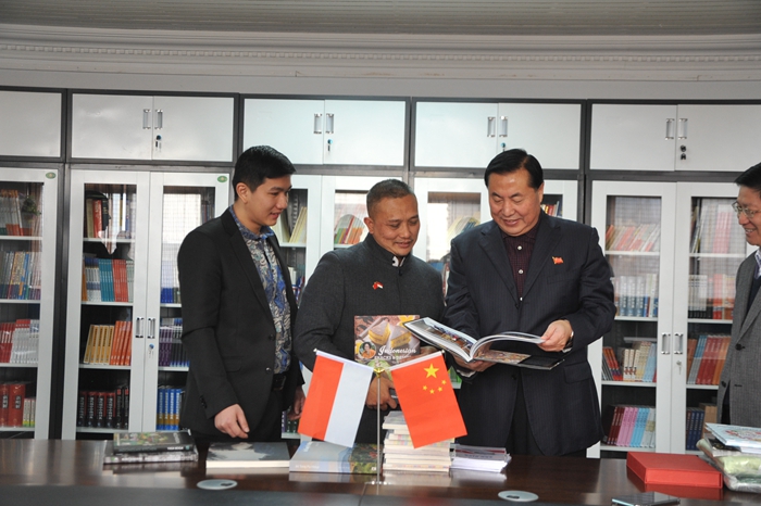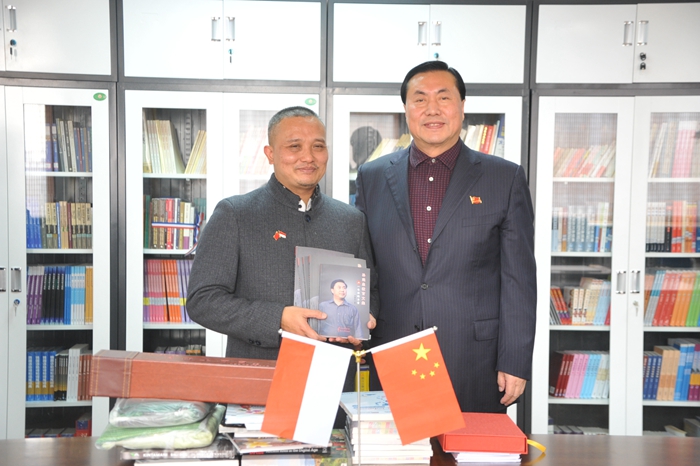 随后,参赞先生向石家庄市外国专家书屋赠送了不同级别的印尼语教材、印尼语等级考试参考书籍、印尼文化宣传册等,表示将全力支持我校的印尼语教学,并与校长互赠礼物。