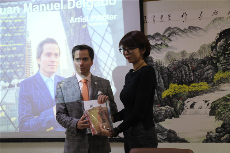 胡安·曼努埃尔·德尔加多·门德斯参观了河北外国语学院美术学院书画展,并为河北外国语学院美术学院的全体师生带来了一场极具艺术性的世界著名青年肖像艺术家国际绘画艺术报告会。