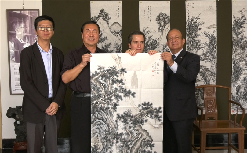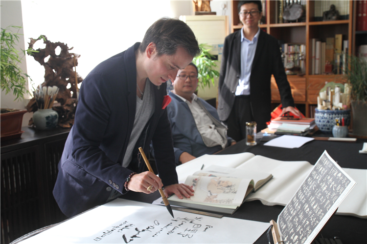 田野老师将自己的折扇画作送给大使先生一行,并向胡安·曼努埃尔·德尔加多·门德斯赠送画作。兴起的胡安·曼努埃尔·德尔加多·门德斯先生,在田野工作室体验起了中国书法,他用中国毛笔写下了对田野老师的敬佩,并创作了一副风景画赠予河北外国语学院。