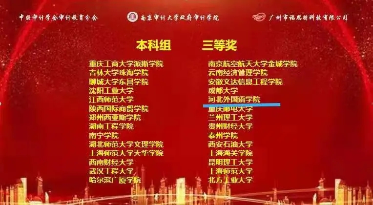 2020年12月19日,由中国审计学会审计教育分会主办的2020年“福思特杯”全国大学生审计精英挑战赛举行。河北外国语学院国际金融学院郭晓冬、王瑛瑛、岳可心三位同学组成的队伍荣获全国三等奖。