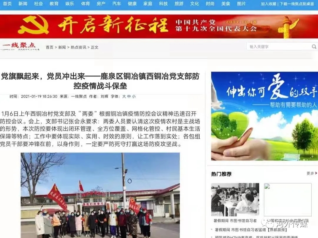在郭阿颖同学参加抗击疫情的活动期间,她所写的文章《石家庄鹿泉西桐冶百余名志愿者投身抗疫一线,热心服务受村民点赞》和《党旗飘起来,党员冲出来——鹿泉区铜冶镇西铜冶党支部防控疫情战斗堡垒》两篇文章先后被学习强国、石家庄日报、今日头条、一线聚点、网易新闻、搜狐视频等六家媒体转发。
