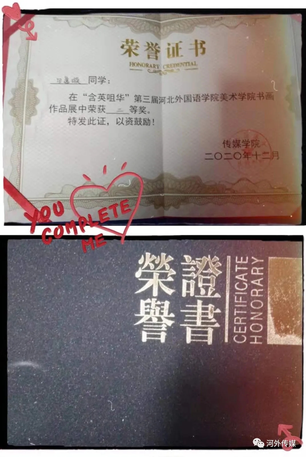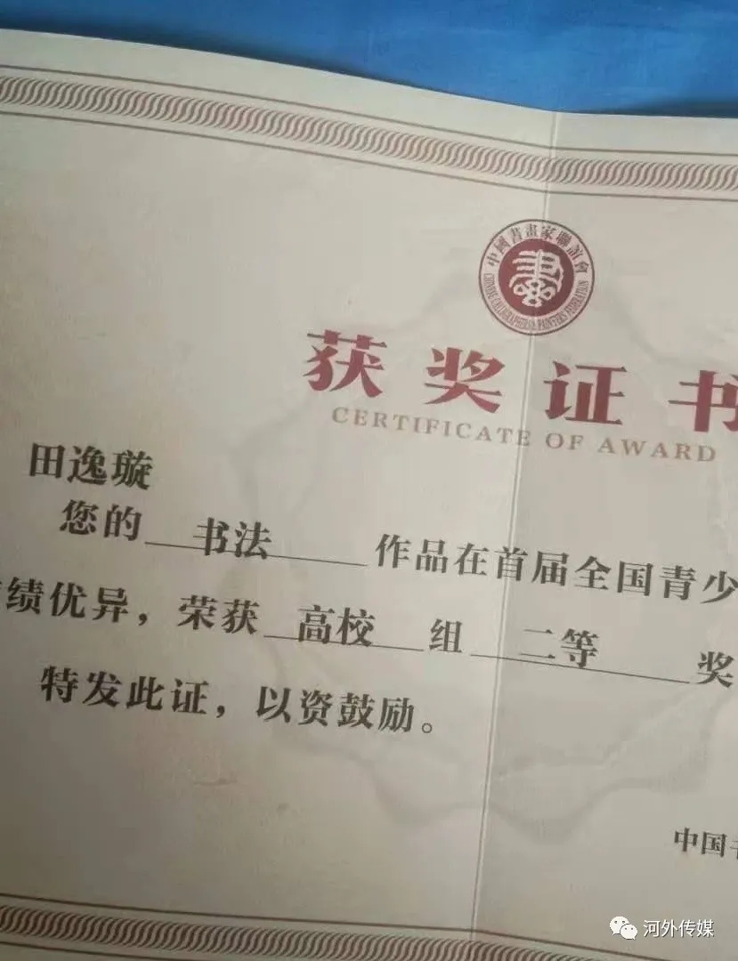 在日常生活中田逸璇同学乐观开朗,积极向上,踊跃参加学校活动。田逸璇同学积极参与活动捐赠书籍贡献了自己的一份力量。在书法的专业上持之以恒的学习,运用自己熟练掌握的书法专业知识取得了一些成就,在这次的首届全国青少年书画网络大赛之中田逸璇同学的书法作品荣获高校组二等奖的好成绩。在“含英咀华”第三届河北外国语学院美术学院书画作品展中荣获二等奖。我们要向田逸璇同学学习用知识丰富我们的人生,用成绩记录我们生活的足迹。