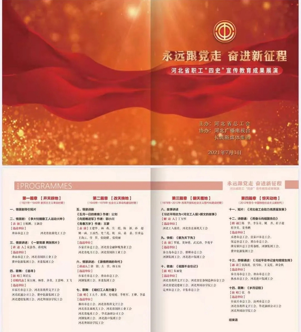 自3月份以来,河北省总工会在全省职工群众中组织开展了“永远跟党走——河北省职工‘四史’宣传教育”。在中国共产党成立100周年之际,河北省总工会领导决定开展河北省职工“四史”宣传教育成果展演,对已取得的成果进行大总结、大检验,对继续掀起学习新高潮进行再激励、再动员。