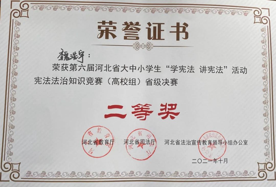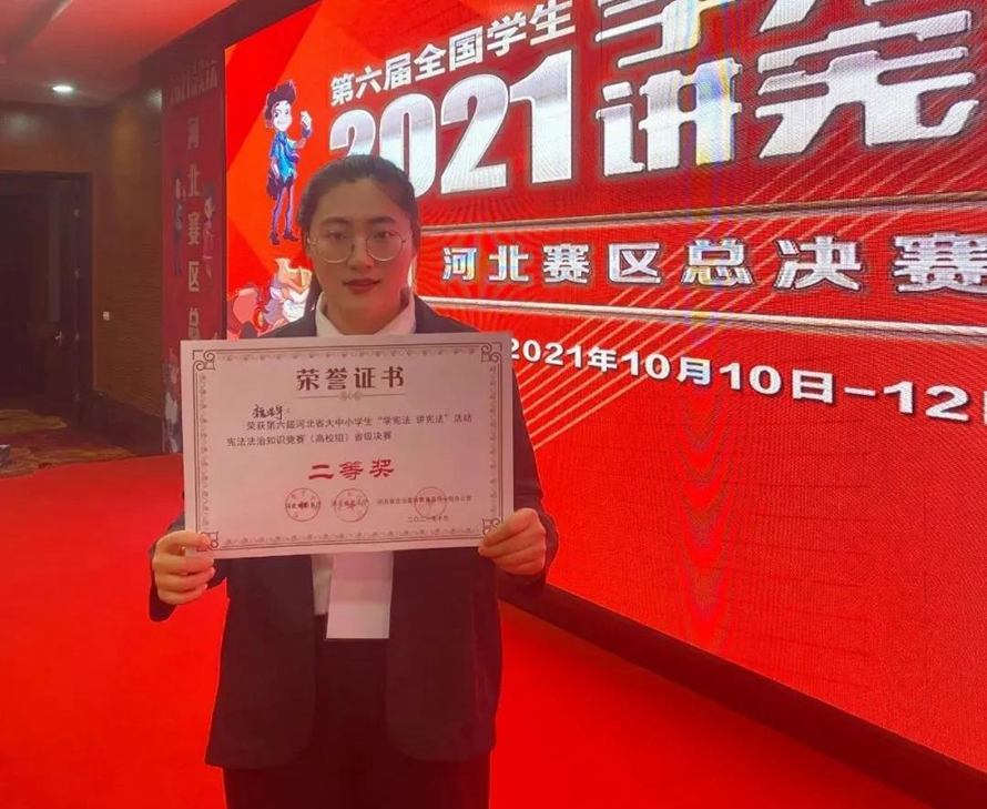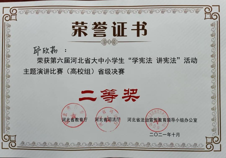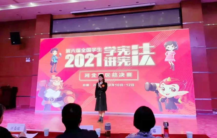 此次活动,由省教育厅、省司法厅、省法治宣传教育领导小组办公室主办,河北师范大学承办,全省共67所高校参加,河北外国语学院两名学生积极备赛。在“学宪法讲宪法”主题演讲比赛中,邱欣茹围绕宪法与青春,从学生视角,结合自身经历,讲述了自己对宪法的理解和感受,用精彩绝伦的演讲和丰富的情感表达感染了在场的每一位观众,获得高校组主题演讲比赛二等奖。魏浩宇在宪法法治知识竞赛中,以扎实的知识储备,获得高校组宪法法治知识竞赛二等奖,是赛场中为数不多的非法律专业同学。他们充分展示了我省青少年学生尊崇宪法、学习宪法、遵守宪法、捍卫宪法的良好精神风貌。